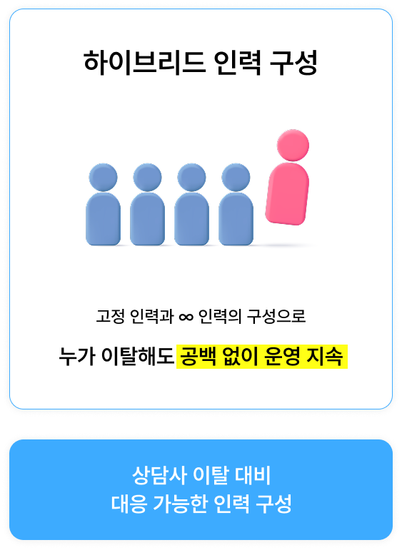 고정 인력 도급에서 벗어나 CS 전문성과 유연성을 모두 갖춘 하이브리드 모델! 상담사부터 CS솔루션까지 풀 패키지 서비스