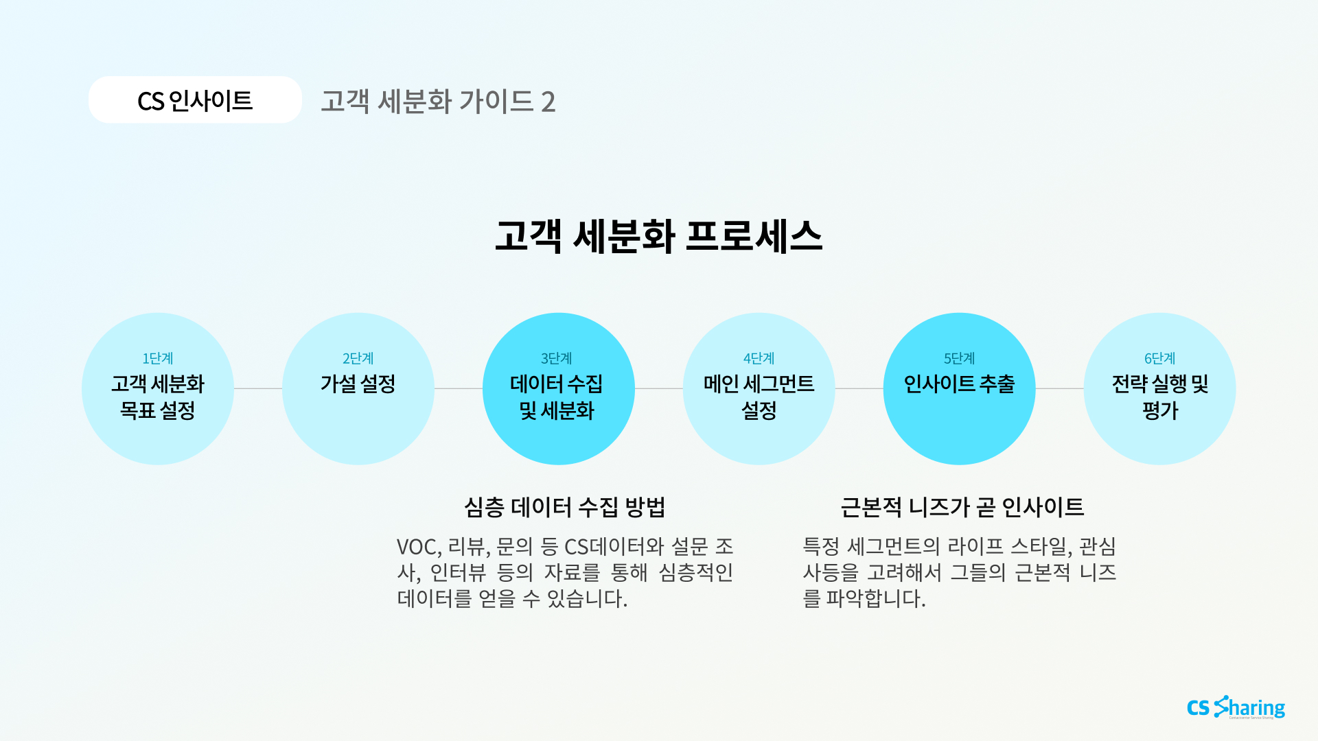 본격적으로 세분화를 위한 데이터를 수집하는 단계입니다. 이미 존재하는 고객들의 정보를 바탕으로 세분화할 수도 있고, 좀 더 심층적인 조사를 해도 좋아요. 심층적인 조사는 VOC, 리뷰 등의 CS 데이터 분석뿐만 아니라 설문 조사, 인터뷰 등을 통한 자료를 모두 포함합니다.